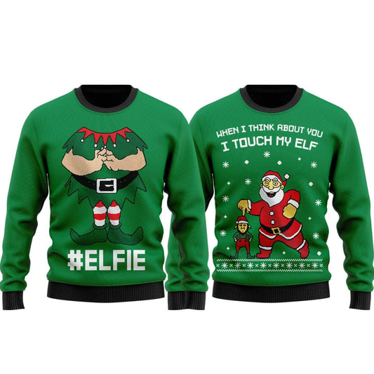 Unifinz Elf Ugly Christmas Sweater Elfie When I Think About You I Touch My Elf Green Sweater