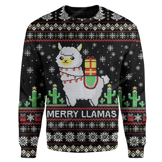 Unifinz Llama Christmas Sweater Merry Llamas Christmas Pattern Black Ugly Sweater