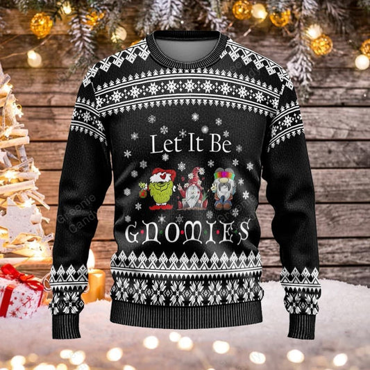 Unifinz Gnome Christmas Ugly Sweater Three Gnomes Let It Be Gnomies Christmas Pattern Black White Sweater