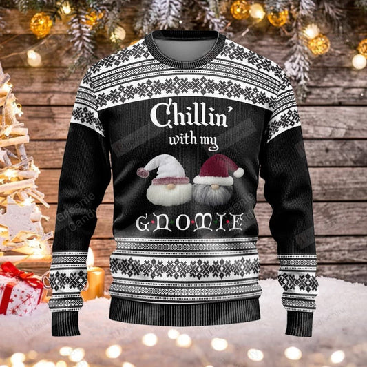 Unifinz Gnome Christmas Ugly Sweater Chilling With My Gnomie Christmas Pattern Black White Sweater