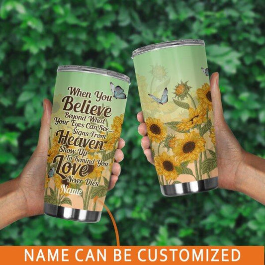 Personalzied Memorial Tumbler When You Believe Sunflowers Butterfly Sign Tumbler 20oz For Mom Dad Someone Custom Memorial Gift M243